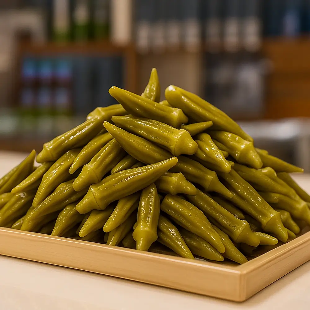 Bamya Turşusu, taptaze bamyaların özenle seçilip geleneksel salamura yöntemiyle hazırlanmasıyla elde edilen, hafif ekşi ve aromatik bir turşu çeşididir. Tarihi Kemerburgaz Turşucusu olarak Bamya Turşusu ürününü en ucuz satış fiyatları ile sizlere sunuyoruz. Kendine has dokusu ve lezzetiyle sofralara farklı bir tat katar.